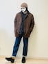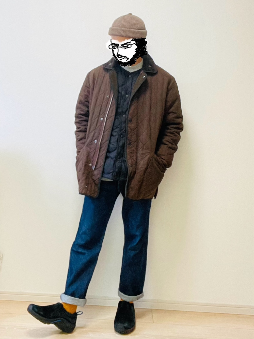 古着のbarbourキルト裏フリースのジャケット。 裏のフリースがオリーブカラーになっていてカッコいい。 首元までしめてもカッコいい。 ファミマの靴下がアクセント。