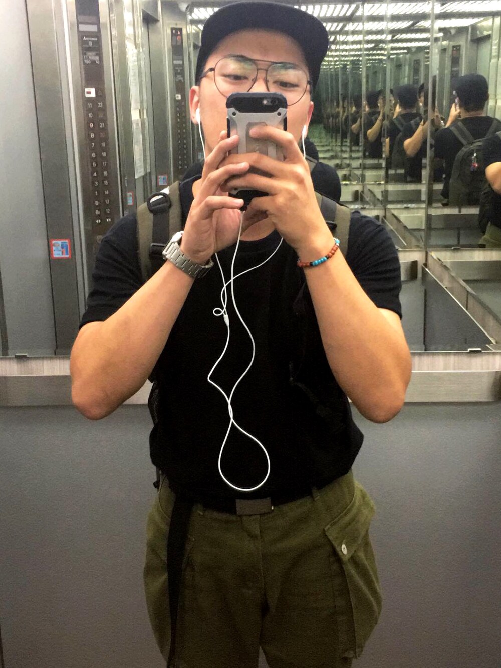 簡單的軍工裝搭配 運用黑素t配上經典軍綠p44長褲 扎進去定出腰線 長版皮帶增加層次感 軍綠後背包與褲子呼應 當作簡單的小細節
