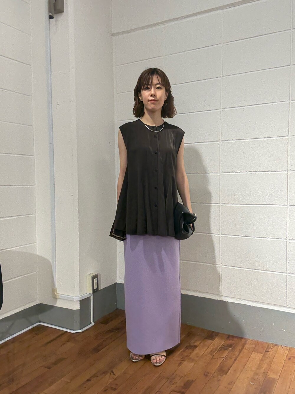 トレンドカラーの上品コーデ 今年トレンドのブラウンでコーデを組んでみました。 ブラウンは、合わせる色によっては秋冬っぽくなってしますのでパープルを合わせることで涼やかさを出しました。 *ブラウス Fサイズ フレアデザインですが、すとんとした落ち感のある生地で甘すぎなず上品さのあるブラウスです。 タックが入ったシルエットで自然なボリュームを出してくれるので痩せ型さんにもおすすめです◎ 広がりすぎない落ち感のある生地で動きやすさもあります◎ 薄手の生地なので裾をインしてジャケットを羽織っても使えます! *スカート FREEサイズ ニット素材のストレスフリーなスカート。 すとんと落ちるシルエットなので身体のラインを拾わず、細見えがかないます! 縦のラインが強調されて脚長効果もあります◎ いつものコーデが新鮮になるパープルなので、今年の秋冬にぜひ取り入れてみてください◎