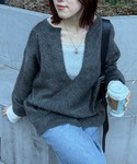 深Vネックでレイヤードコーデをしてみました。寒くなってきたらロゴ入りのロンTと重ね着してもバランス良く決まりました◎ シンプルなロゴでブラウス生地のロンTなので1枚あると大人の外しアイテムで重宝します! ※全てフリーサイズ