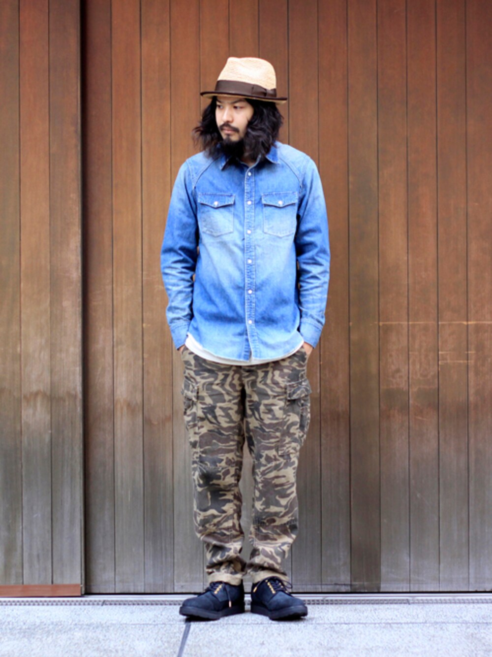 PIPING STRAW HAT BEIGE VINTAGE DENIM SHIRTS SIZE1 LINEN CAMO MILITARY PANTS SIZE1 VOLUME SUEDE SHOES BLACK 26CM