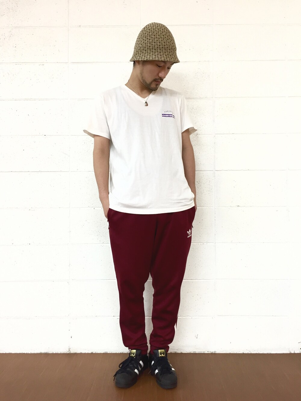 OLD SKOOLの着こなしだが、首元はVネック、ハットは柄にすることにより新しさもプラス。 リラックスウェアのようで、しっかりとオシャレに見えるところはさすが。 http://various-id.shop-pro.jp/