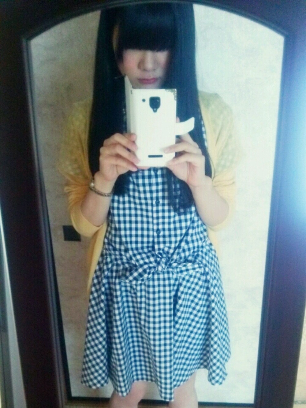流行りのギンガムチェックにイエローのカーディガンを羽織って元気な感じで。