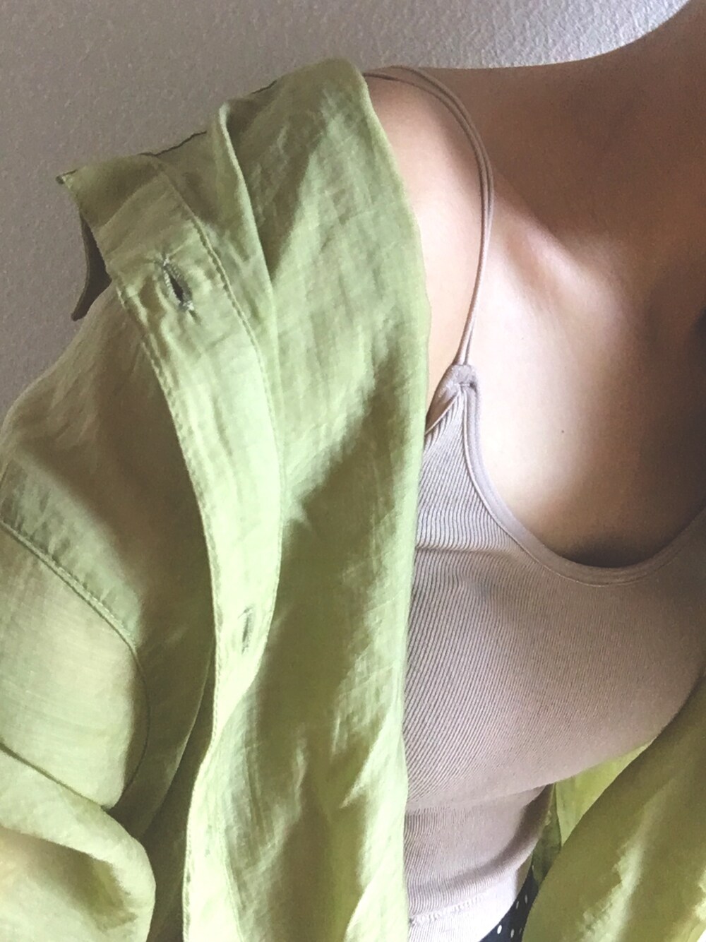 雨で休みの日は、ブラ付きキャミで楽チンコーデ☂️ 緑とベージュは好きだな〜。