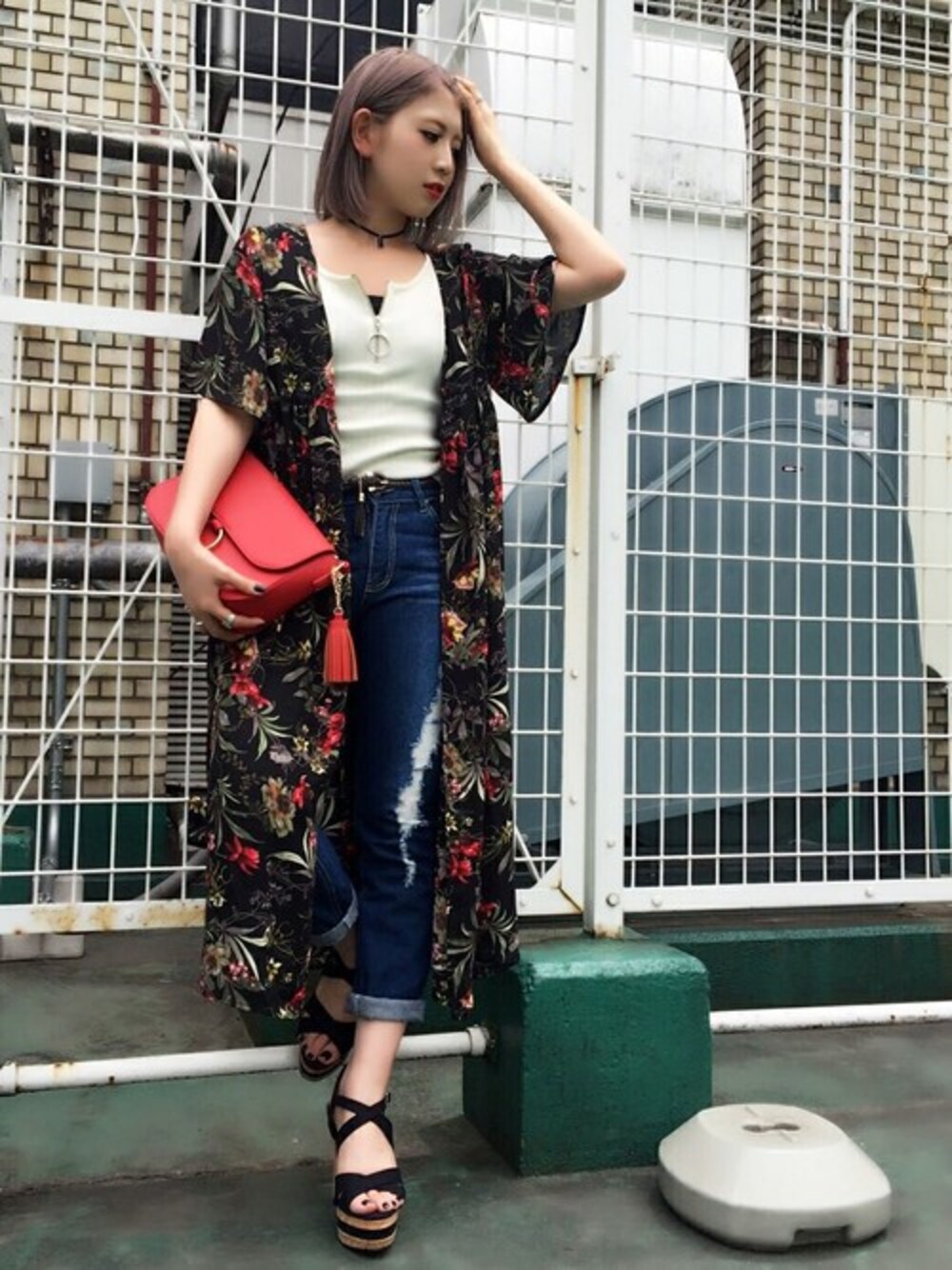 カーディガンのように羽織れるシャツ、その名も「シャツディガン」です! ボタンを閉めてワンピース風に、前を開けてガウン風にと着方のアレンジができるまさに万能アイテム! デニムなどにざっくり合わせて着こなすのがおすすめ。 花柄プリントの赤色をバックでリンクさせて、こなれ感UP♪