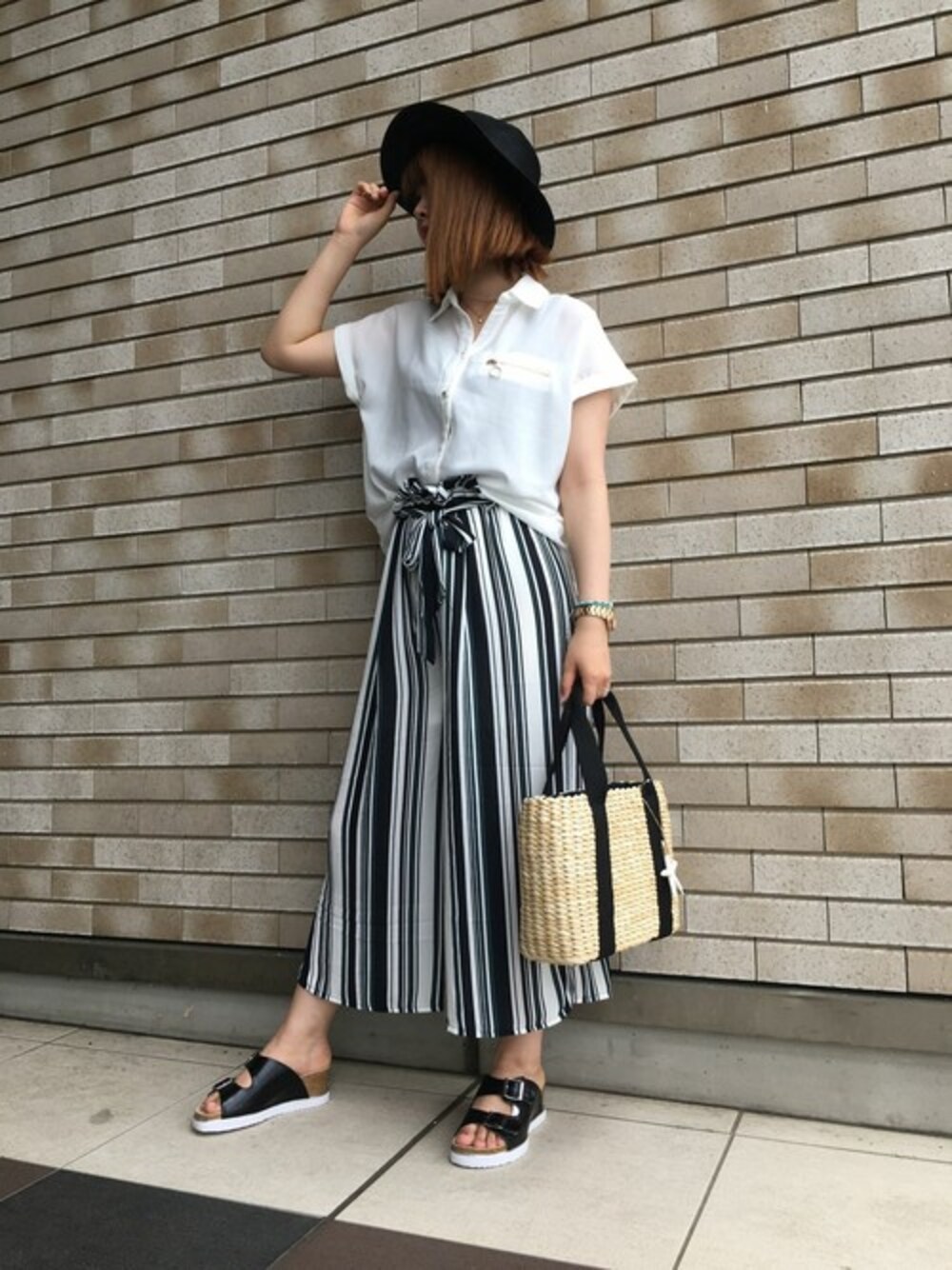 ざっくり着て様になるゆるシルエットのシャツにストライプのワイドパンツでコーデ♪ シャツは、リングジップ付きでひと味違ったデザイン! モノトーンでまとめて、大人のこなれた夏スタイルに。