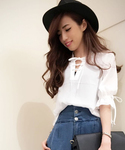 大きく開いたVネックとレースアップが目を引く旬顔ブラウス。袖口もギャザーリボンで可愛い♪ ハイウエストのデニムパンツで合わせたら、カジュアル感がプラスされ、夏のきれいめカジュアルが完成です。