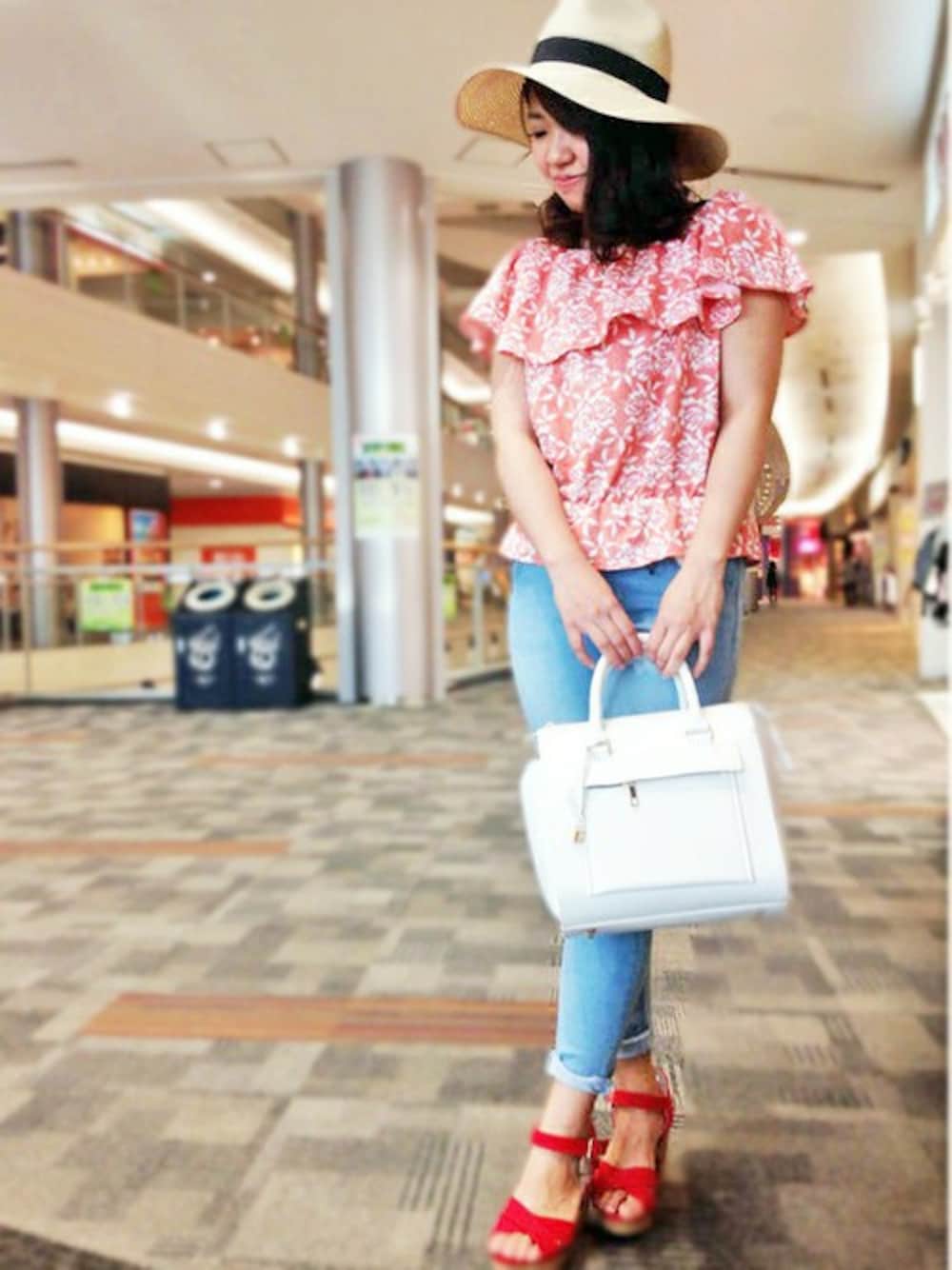 スタイリングをライトにしてくれる総花柄が魅力のオフショルブラウス! ストレッチが効いてるのですっごい楽チンですよ♪ 今季は、HATやスニーカー合わせでMIX感ある着こなしがおすすめ。 HATから足元のサンダルまで、初夏のリゾートスタイルです(^^)!