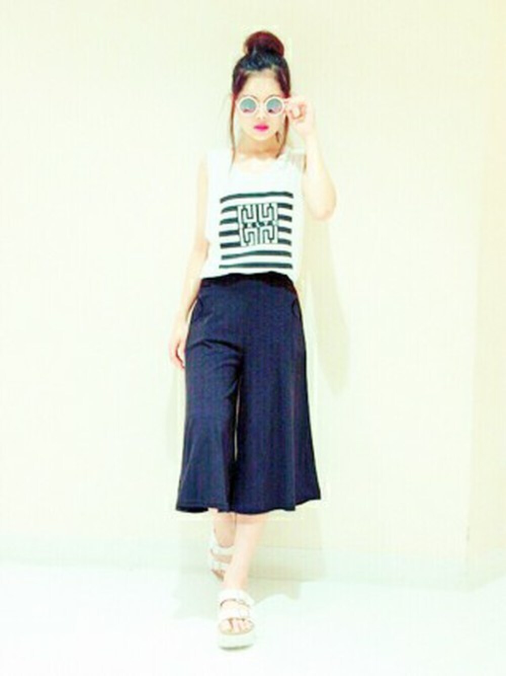 大胆かつスタイリッシュなプリントがあしらわれたノースリTシャツ! 少しメンズライクなオーバーサイズがポイントで、ゆるっと今年らしく着こなせます。 ボトムをシンプルにすることで大人っぽさを入れました。