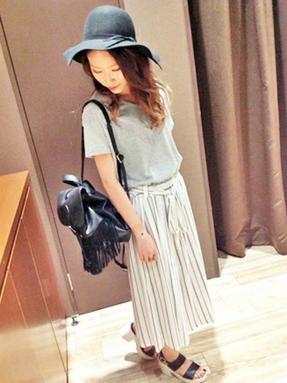 TOPSのTシャツは、シンプルですが物足りなさがなく使いやすいアイテム♪ Tシャツもフリンジで、気付いたら持っているリュックもフリンジでフリンジだらけのコーデになっていました(=゚ω゚)ノ フリンジ可愛いですよね♡!エレガントな帽子で大人フリンジコーデ☆
