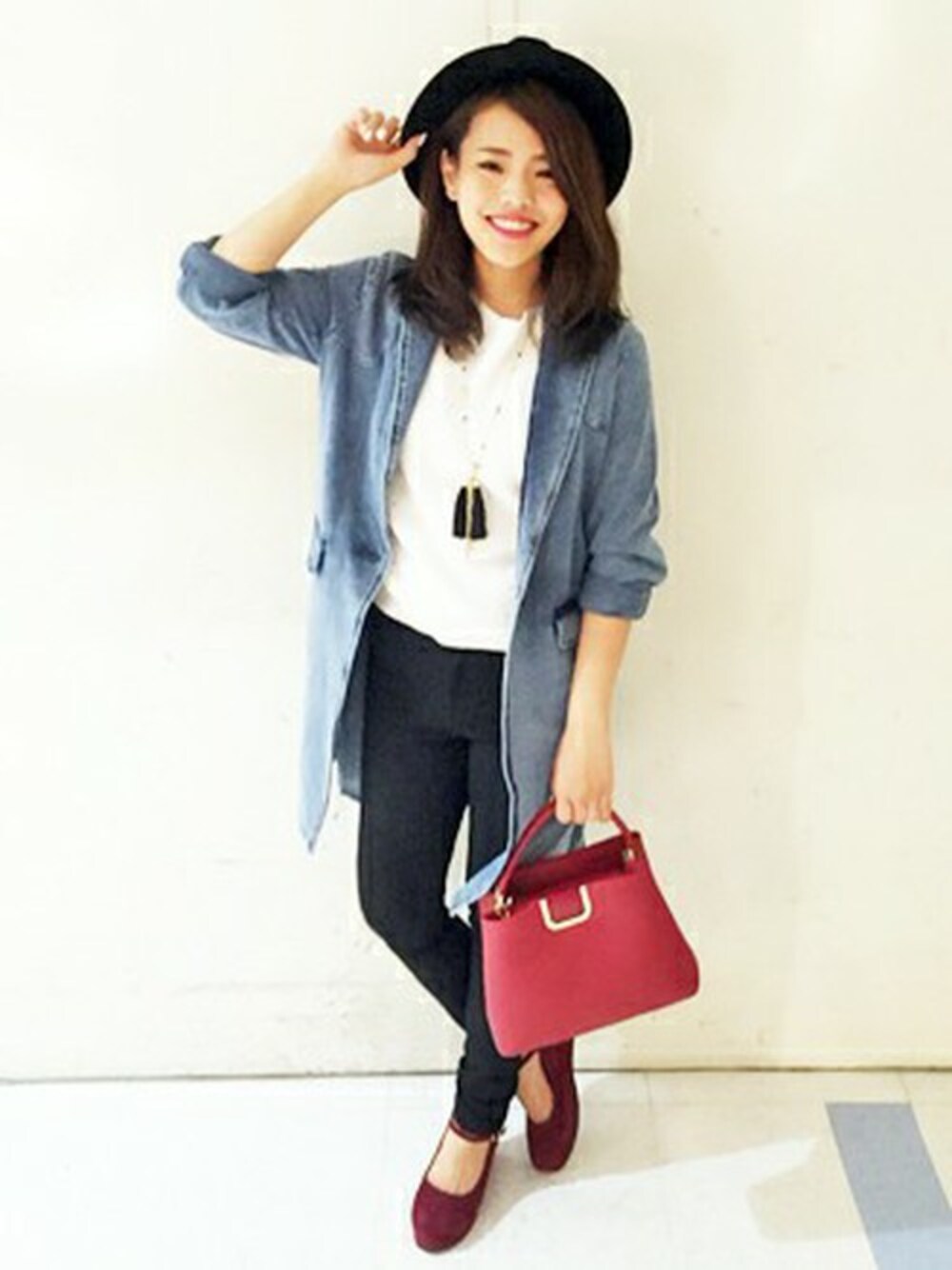 大人気の、デニムチェスターコートをスキニーでかっこよくコーディネート(^^)! パンプスと、バックのボルドーを差し色で入れ、オシャレ感MAXです(*゚▽゚*)!! デニムチェスターコートは素材が柔らかく、サイズ感もゆったりしているのでニットやトレーナーなどもOK◎