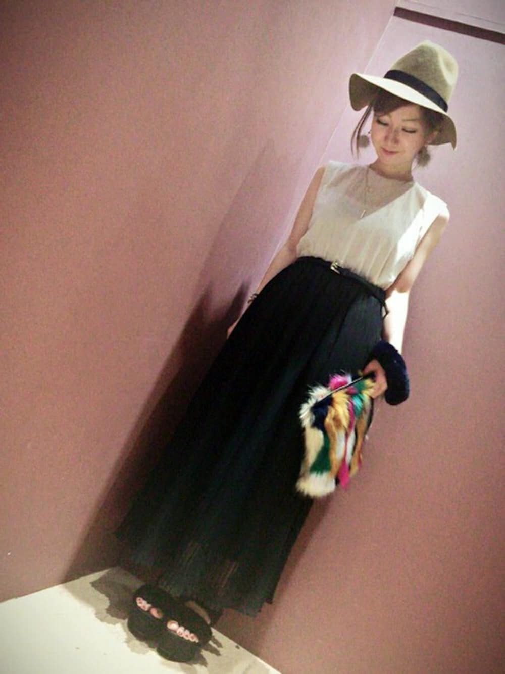 黒のプリーツスカートは、女性らしい気品がありますね(^.^)♡ モノトーンは落ち着いた雰囲気を醸し出してくれます.*゜ ファークラッチはカラフルで、遊び心があってカワイイ♡ ファーが鮮やかなので、コーディネートのポイントになります!