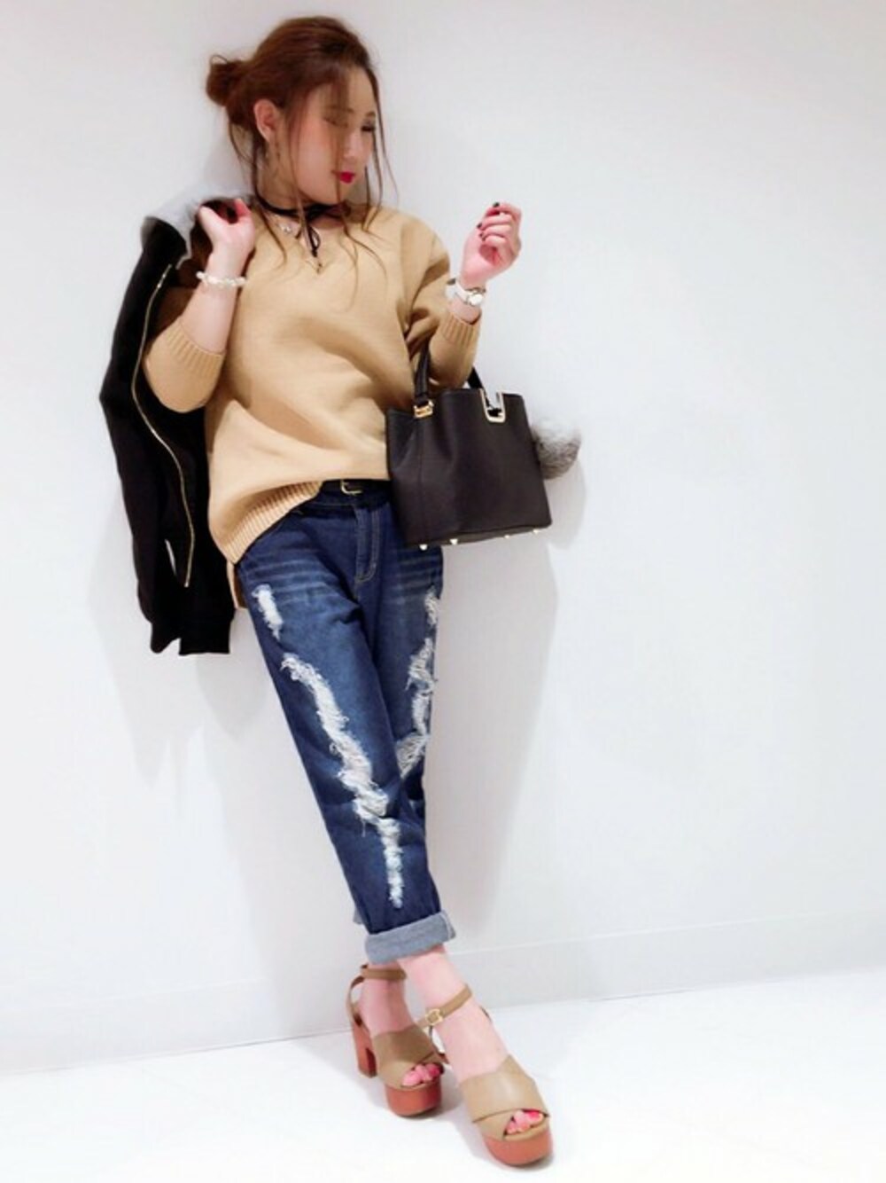 ニットコーデ ☺♪ キャメルのニットは秋の定番でカワイイ♡(´ ` ) 人気のVネックなのもポイント高め*゜ シンプルなデザインにリブが効いて、かわいくなっています♪