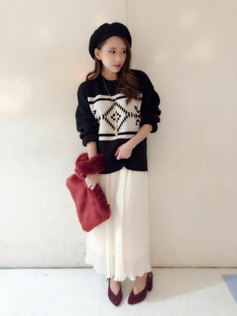 オルテガ柄プルオーバー モノトーンに差し色のボルドーが映えるコーデです(^-^) カジュアルなニットには、プリーツスカートやパンプスを合わせて 女性らしくまとめるのがポイント!◎ 夏のプリーツスカートを秋らしく着こなしました(。>v<。)