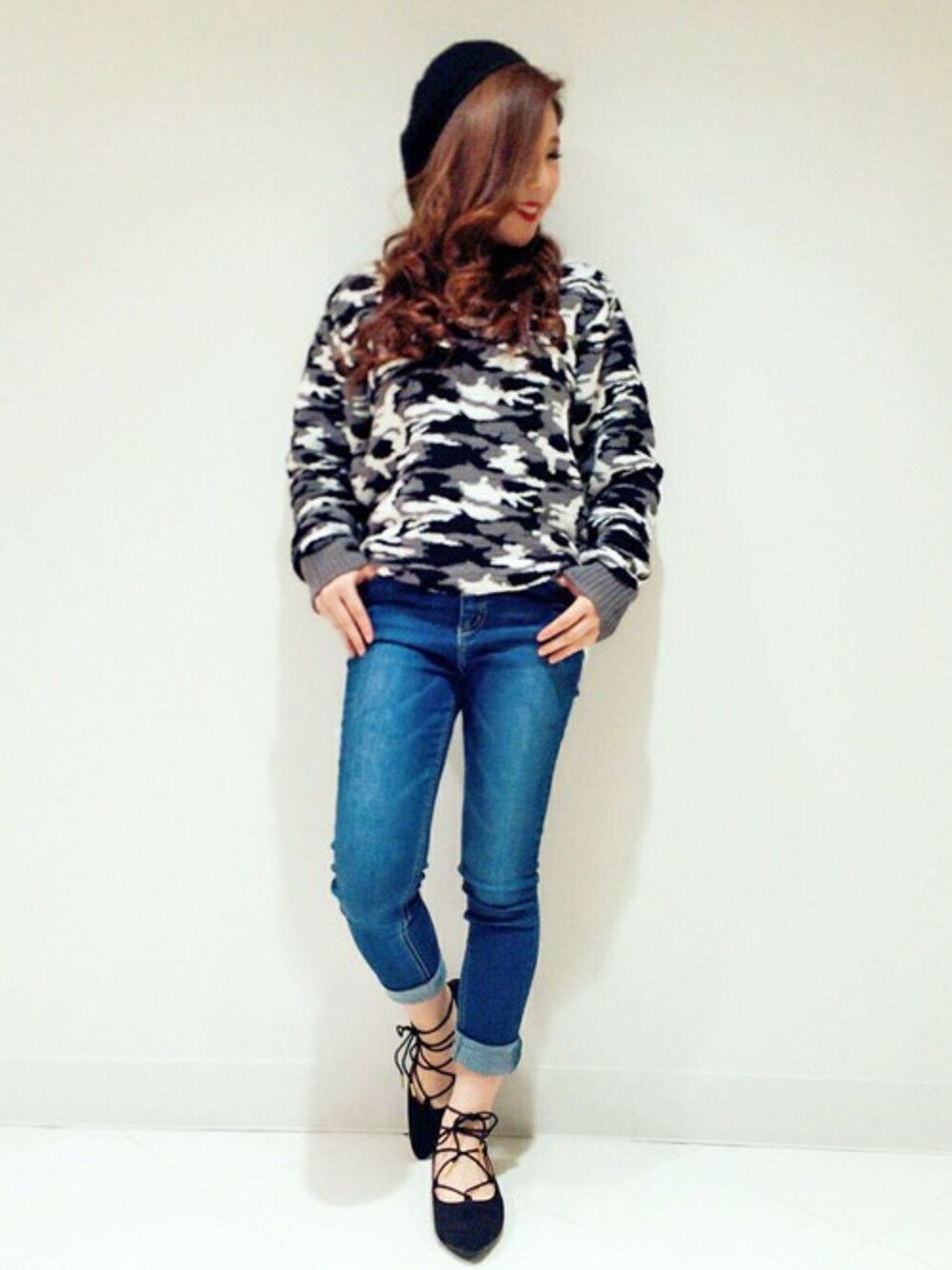 メンズのカモフラ柄ニットをチョイス♪女性が着ても程よいゆるさともこもこ感がかわいいんです♡ 足元は女の子らしいレースアップシューズを合わせて、違った雰囲気をうまく組み合わせてo(*′▽`)〇))"