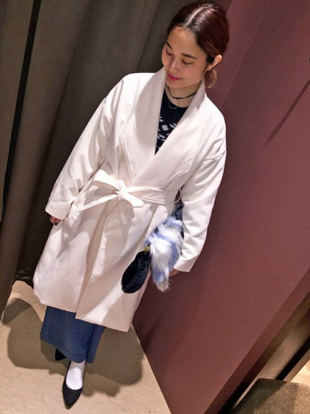 冬らしさ満点のホワイトアウターで大人コーデ♡ 裾から覗くデニムとファークラッチのブルーが、雪景色を思わせますね.*゜ ポイントになるブラックがコーデを引き締めるので、洗練された印象になります!