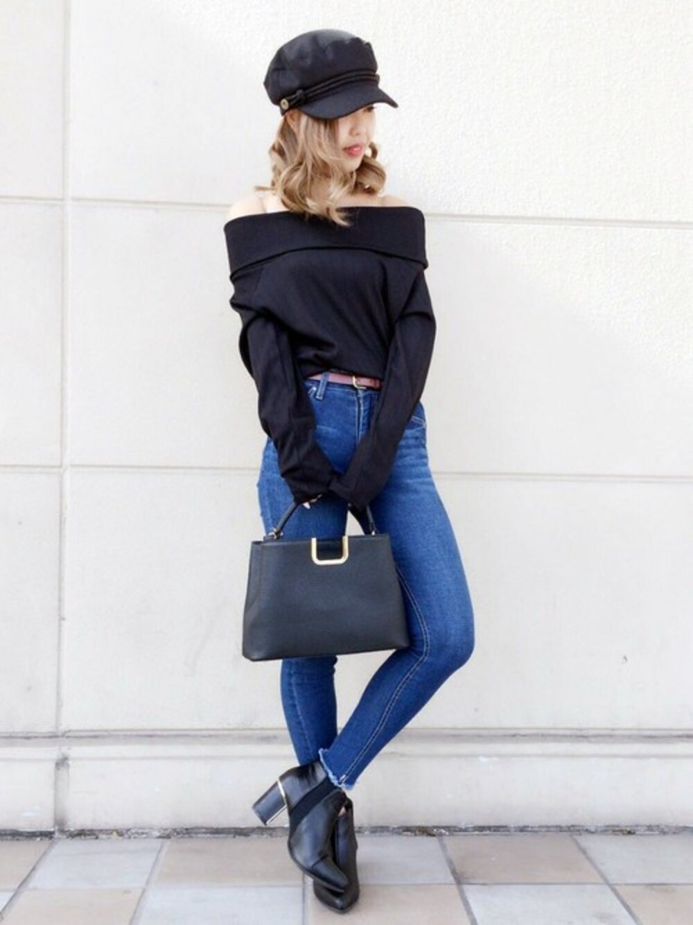 華奢見えを叶えてくれるオフショルは、昨シーズンに続き今年もトレンド継続! ニットソーなのでとてもやわらかく、暑苦しくないから春トップスとしてぴったりです。 フリンジのデニム以外はブラックで合わせれば、かっこ可愛いスタイリングに♪
