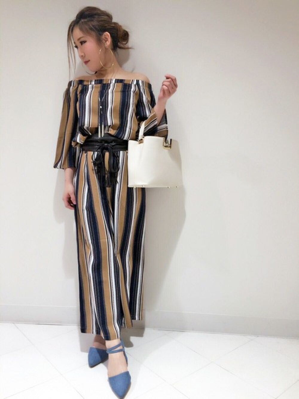 民族ライクな マルチストライプ♡♡ レトロな配色がカワイイ オフショルダーとスカンツです☺ 縦長ラインが強調される ストライプ柄 ▥ . トレンドのサッシュベルトで ウエストマークすれば、 シルエットにメリハリが出て 脚長効果も・・・♡