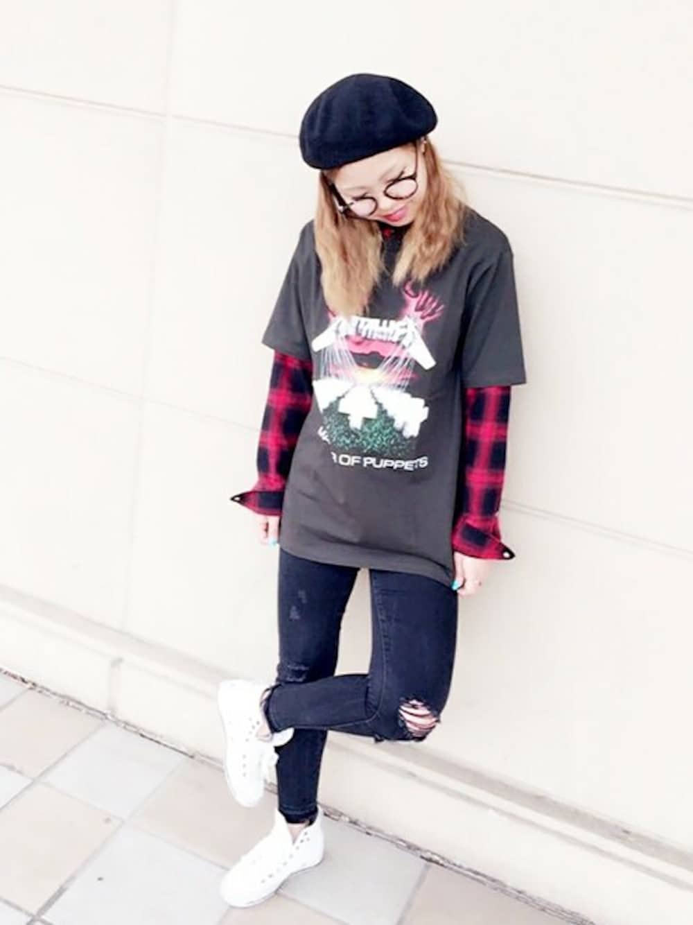 今流行りのメタリカTシャツ☆ M、L.サイズがあるので女性の方も男性の方も着ていただけますよ♪ 私はLサイズにメンズのチェックシャツを着て少しゆったりなコーディネートをしてみました♡
