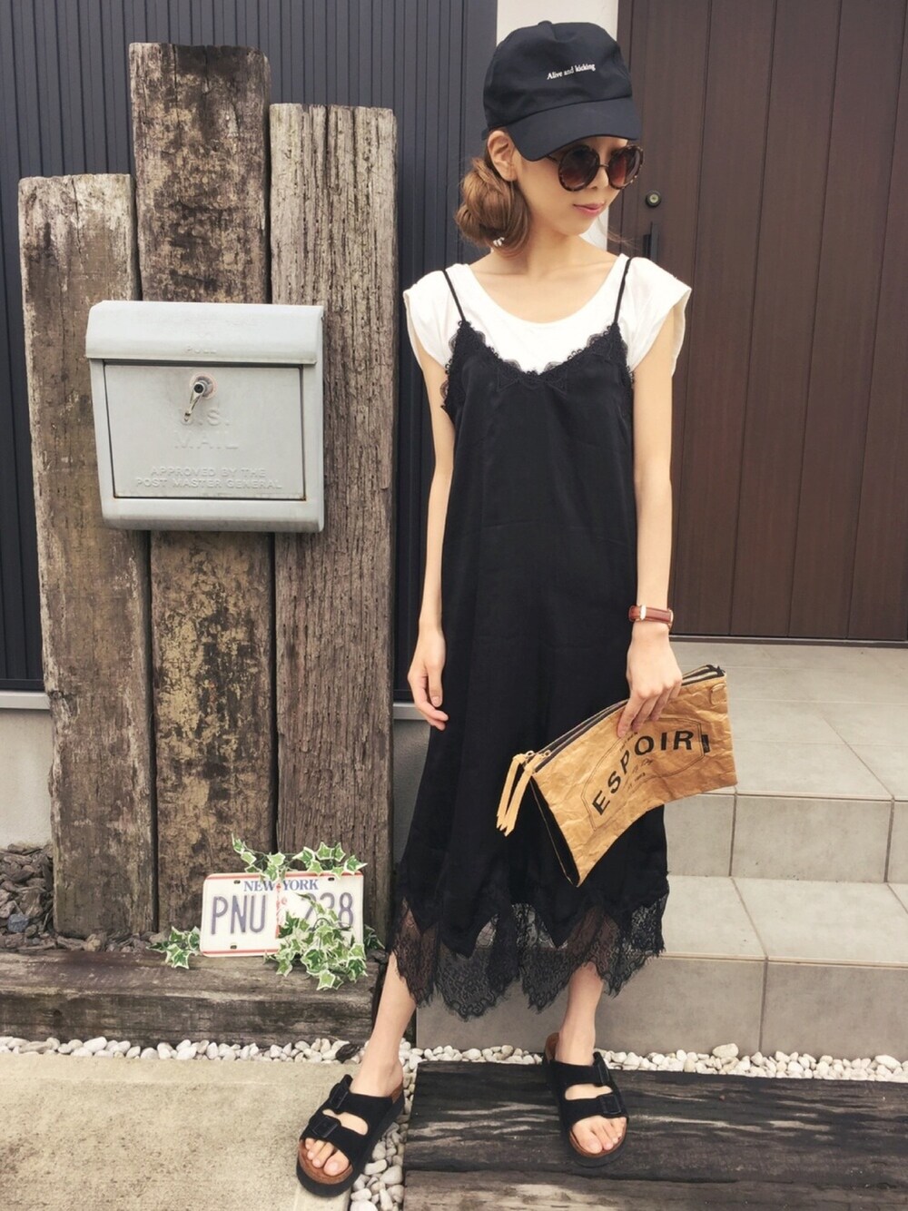 夏はワンピースコーデが涼しくてラクチン!モノトーンでまとめたコーデにペーパークラッチバッグのアクセント。 今日は暑かったからまとめ髪。
