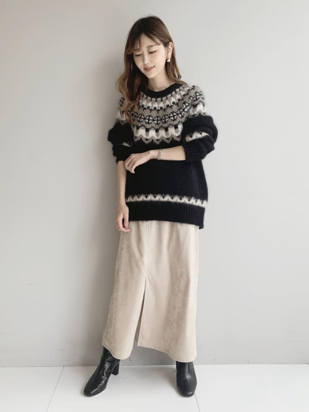 清水夏姫のニット/セーター「【BATONER】2021AW MOHAIR NORDIC CREW NECK/BN-21FL-050 スーパーキッドモヘヤ&ベビーアルパカ ノルディック柄クルーネック」を使ったコーディネート