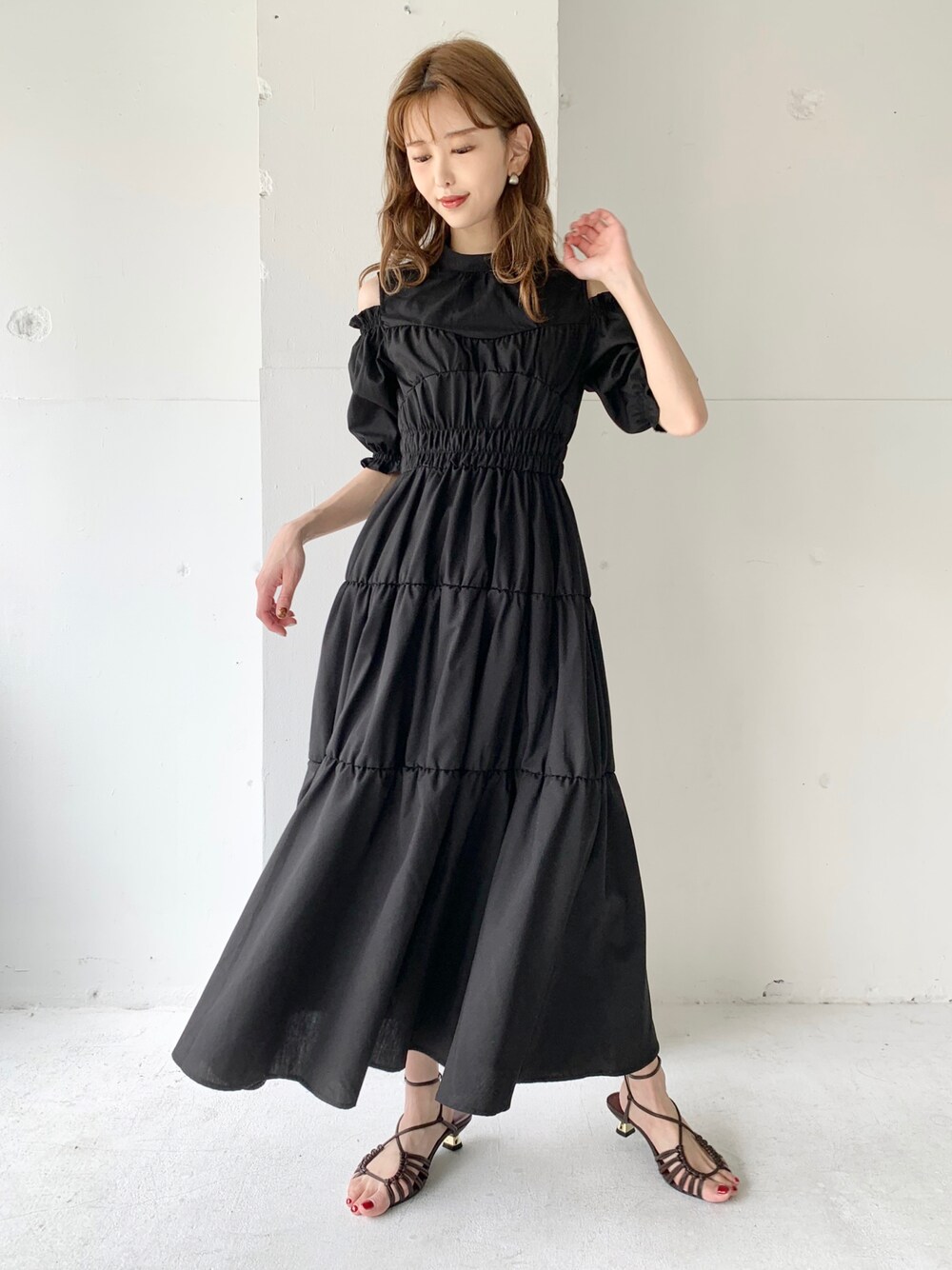 清水夏姫のワンピース「【清水夏姫コラボ】肩開きティアードワンピース」を使ったコーディネート