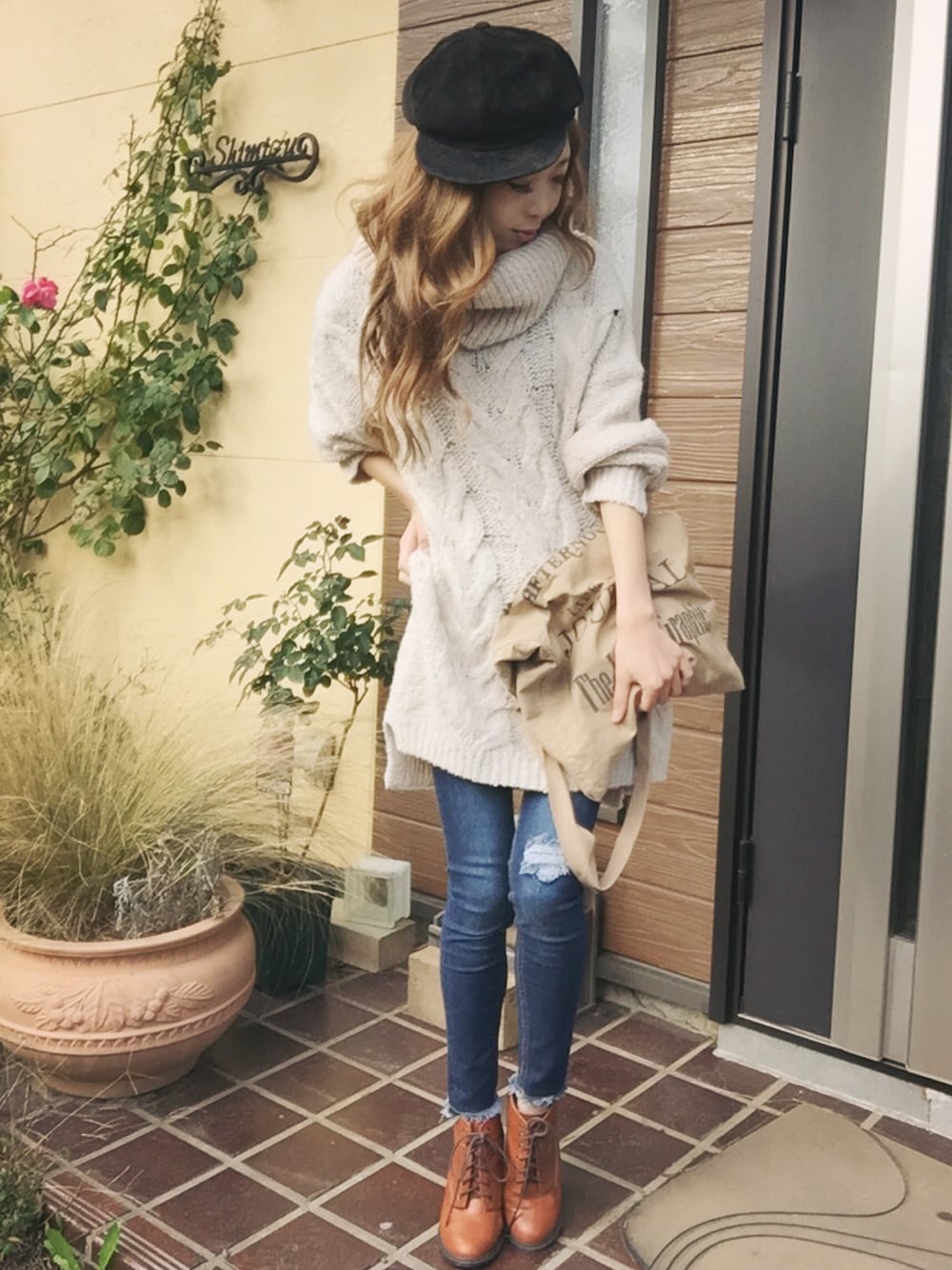 お気に入りのニットワンピ。白タートルって可愛くて、ガーリーになりがちだけど、今回はデニムスキニーとキャスケットでちょっとボーイッシュに着てみたよー。 todayfulのトートバッグは2つに折ってクラッチ風にしてみたよー。