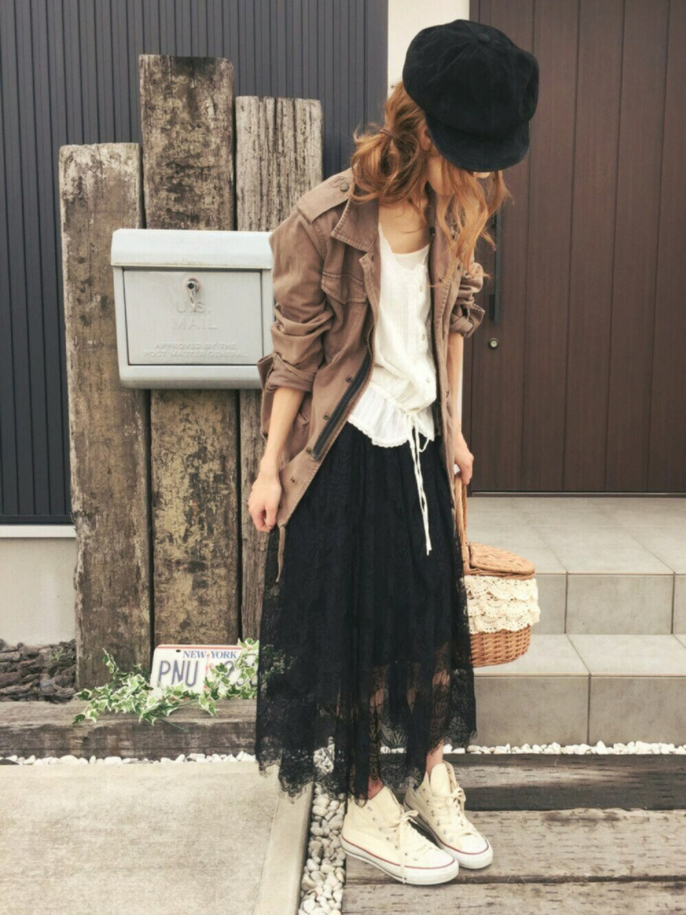 ギャップのあるコーディネートがやりたくて、ガーリーなスタイルを、ミリタリージャケットとワークキャップでワイルドでメンズライクにハズしてみました。