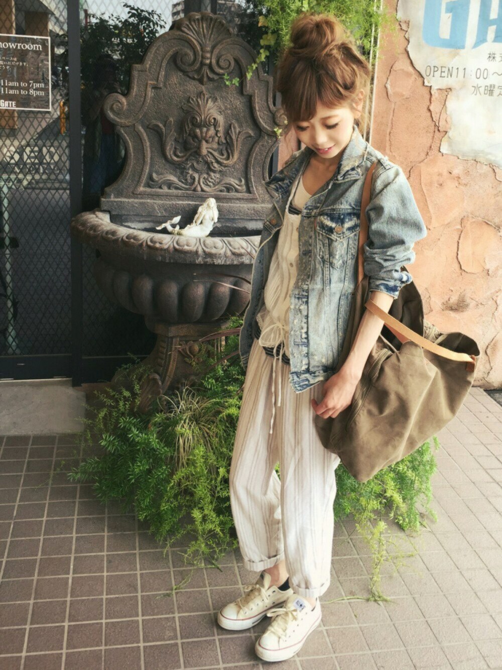昨日は仲良しな元職場メンバーでお出かけ。沢山歩くことを予想してラフに。 白×白でオールインワン風に。 朝は雨だったからすっきりお団子に。カーキのバッグとGジャンでカジュアルさをプラス。