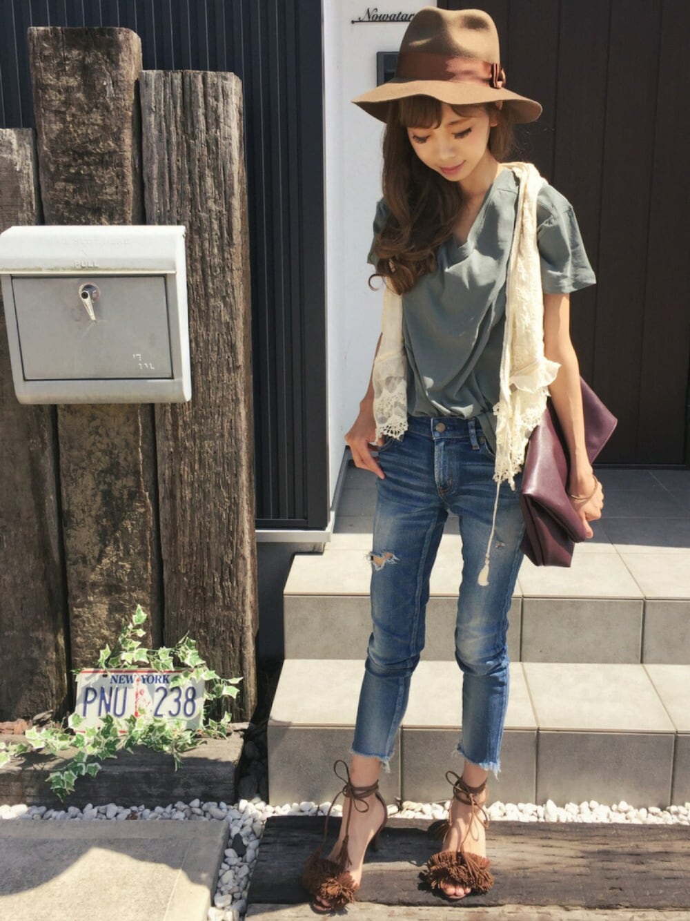 涼しげ夏コーデだけど、フェルト素材の中折れハットとボルドーのクラッチで秋らしいアクセント。まだまだ暑いけど、ちょっと秋を漂わせるコーディネートしたい。