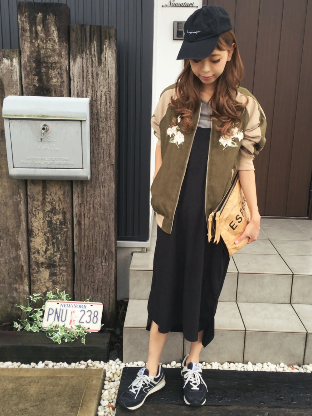 刺繍のスカジャン。着るだけでトレンド感アップ!インナーはラフなワンピース。トップスとセットなのが嬉しい。