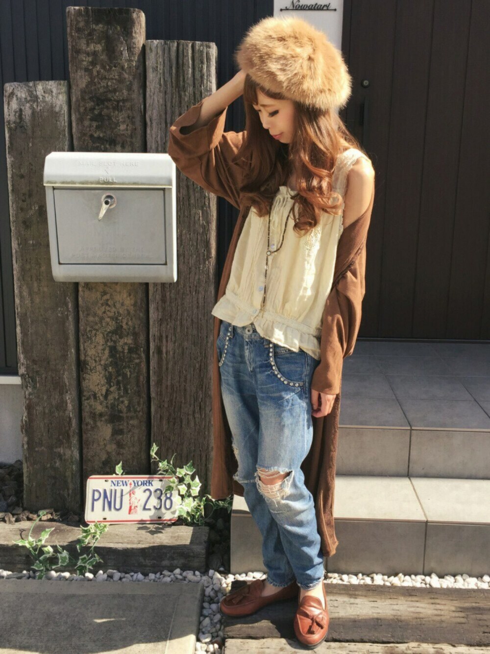 やっぱりブラウン好きだな〜。 OZOCのフェイクスエードのロングカーディガンは刺繍が入っていてボヘミアンな印象で可愛い。素材も薄手だから、肌寒い今の季節にピッタリ! OZOCのファーベレー帽もふわふわで可愛くてお気に入り!一気に秋らしくなるアイテム。 個人的に、ノースリーブor半袖×冬帽子の組み合わせ大好きなんです。今の時期しかできないから沢山しておこう。