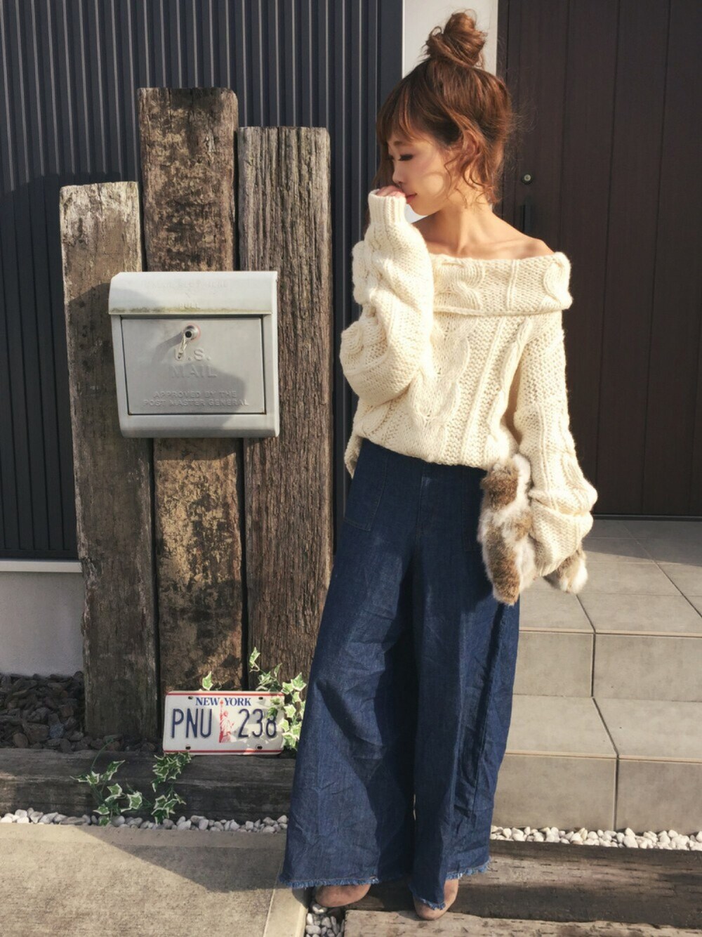 女子力ニット、あえてワイドデニムと合わせてみました。可愛いアイテムをハズすの大好き。 全体的にゆる〜く。