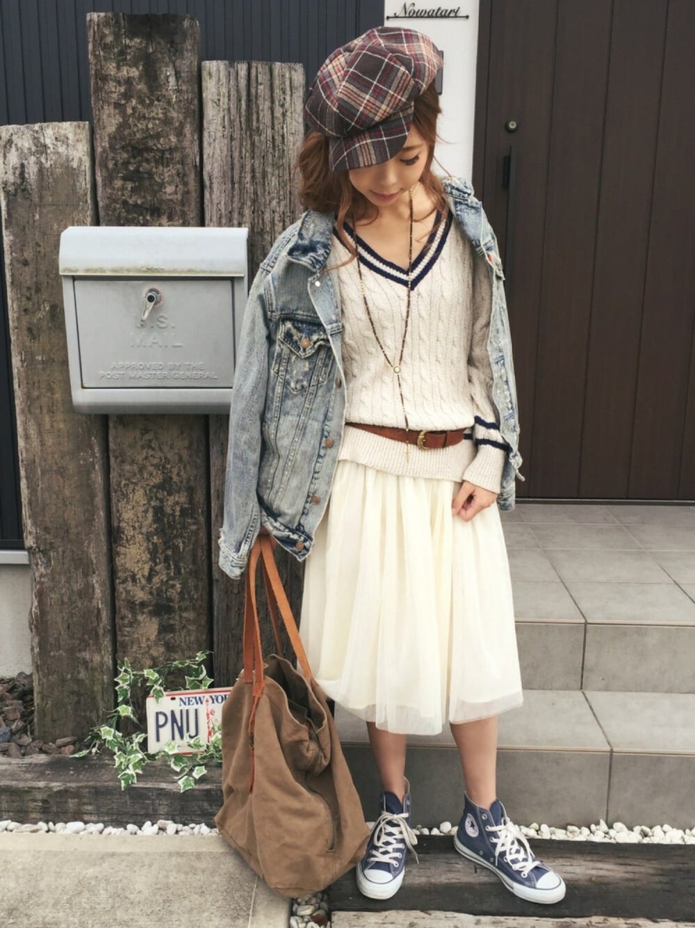 オフホワイト×オフホワイトでワンピース風。同色でもウエストにベルトを巻くだけでラインも綺麗に見せてくれるしアクセントにも。ゆるGジャンを羽織っただけのラフスタイル。 ヴィンテージ感ある小物で統一(^^) 最近キャスケットブーム。