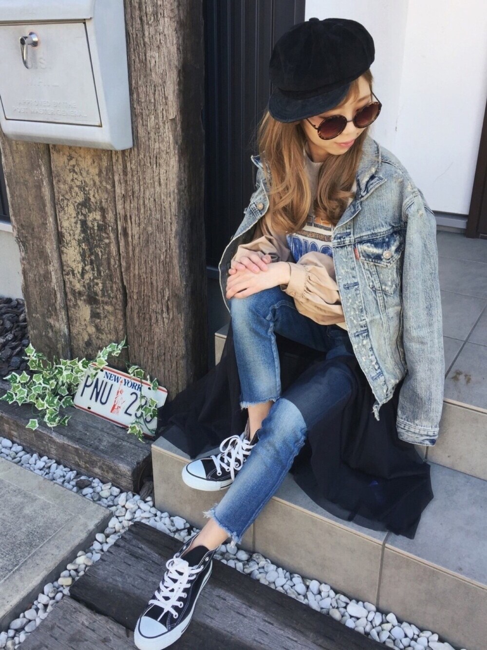 清水夏姫のデニムパンツ「フレイドヘムストスリ」を使ったコーディネート