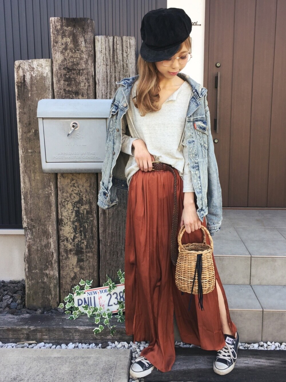 普段ボトムはデニムが多いので、思い切ってオレンジに挑戦!燻んだヴィンテージ風のカラーなので挑戦しやすいオレンジ(^-^) テロっとした素材がとっても履きやすい!トレンド感あるスリットもお気に入り♪ トップスは敢えてシンプルに。コンバースとGジャンでカジュアルさもプラス(*´ω`*)