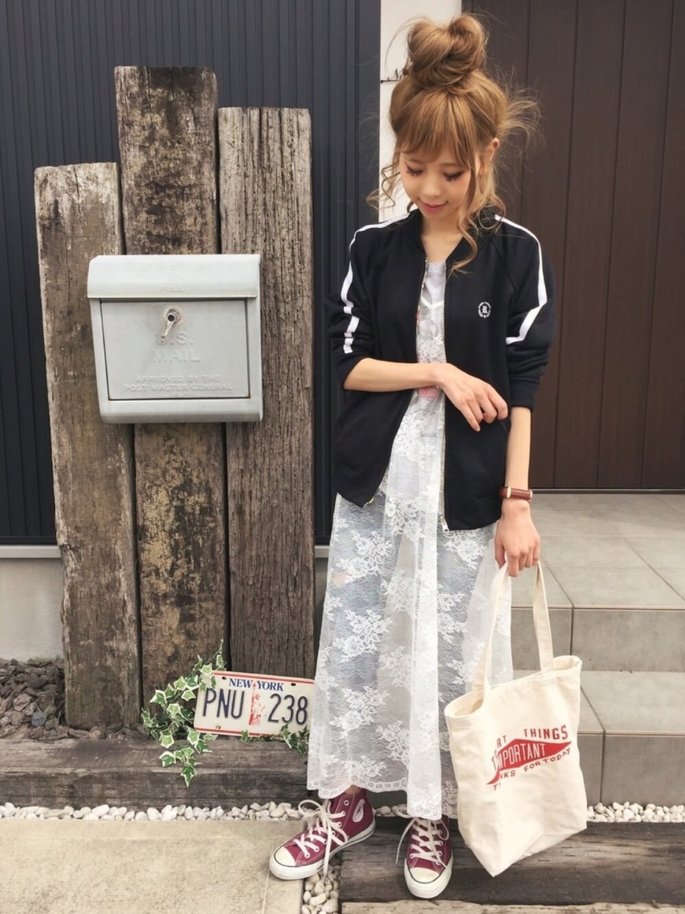 お気に入りのキャミレースワンピース、今回ジャージと合わせてスポーツミックスコーデ♪ 肌寒い日にぴったり! 小物は赤で統一(^-^)