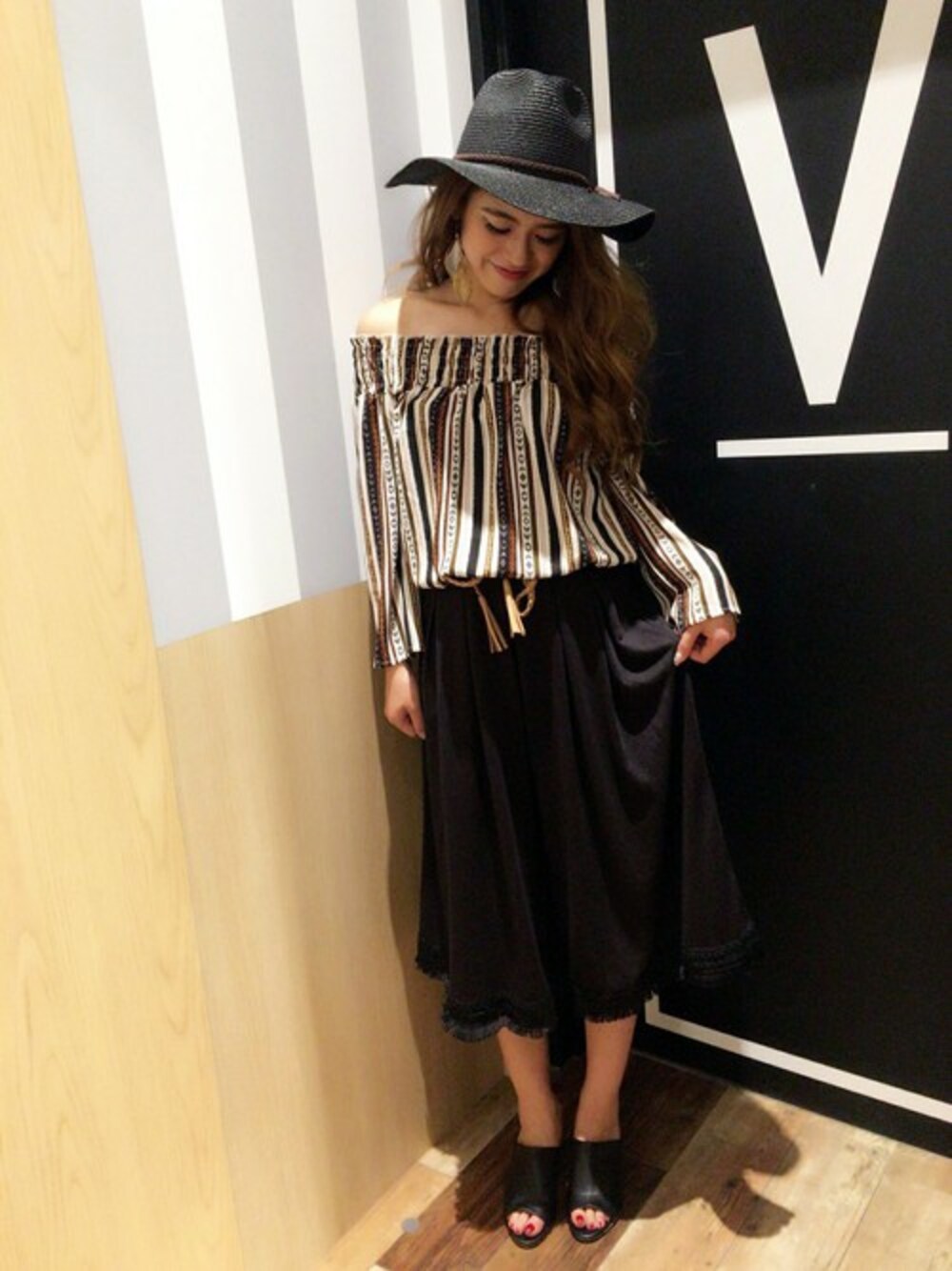 今、気になるオフショルダー!!思いきってデコルテを出してセクシーに(≧y≦*) 裾がフリンジになったガウチョカパンツに合わせて、甘辛エスニックコーデ♪ トレンドアイテムをお洒落に着こなして!!