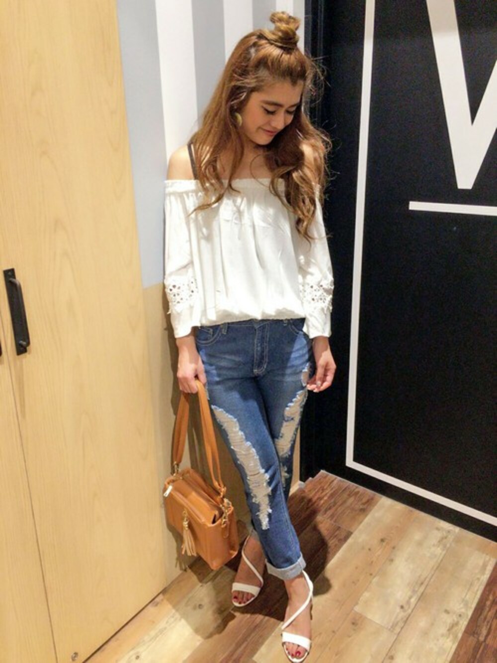 chiapiのTシャツ/カットソー「フレア袖オフショルプルオーバー」を使ったコーディネート