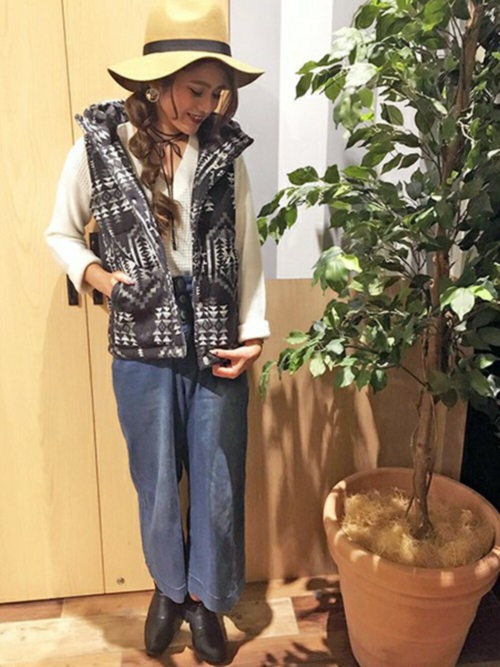 人気のネイティブ柄中綿ベスト\(^o^)/ デニムワイドとの組み合わせがオススメです!!! 中綿入りなので着心地がとても良いです♡ アウトドアな雰囲気があるコーデです(。>v<。)