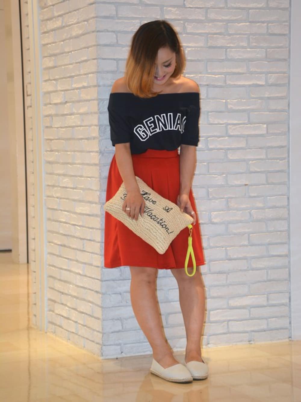 ひざ丈フレアスカートは、とってもガーリーなアイテム。カラーがピリッとアクセントになって、甘くなりすぎず、カジュアルなものからキレイめまで相性◎