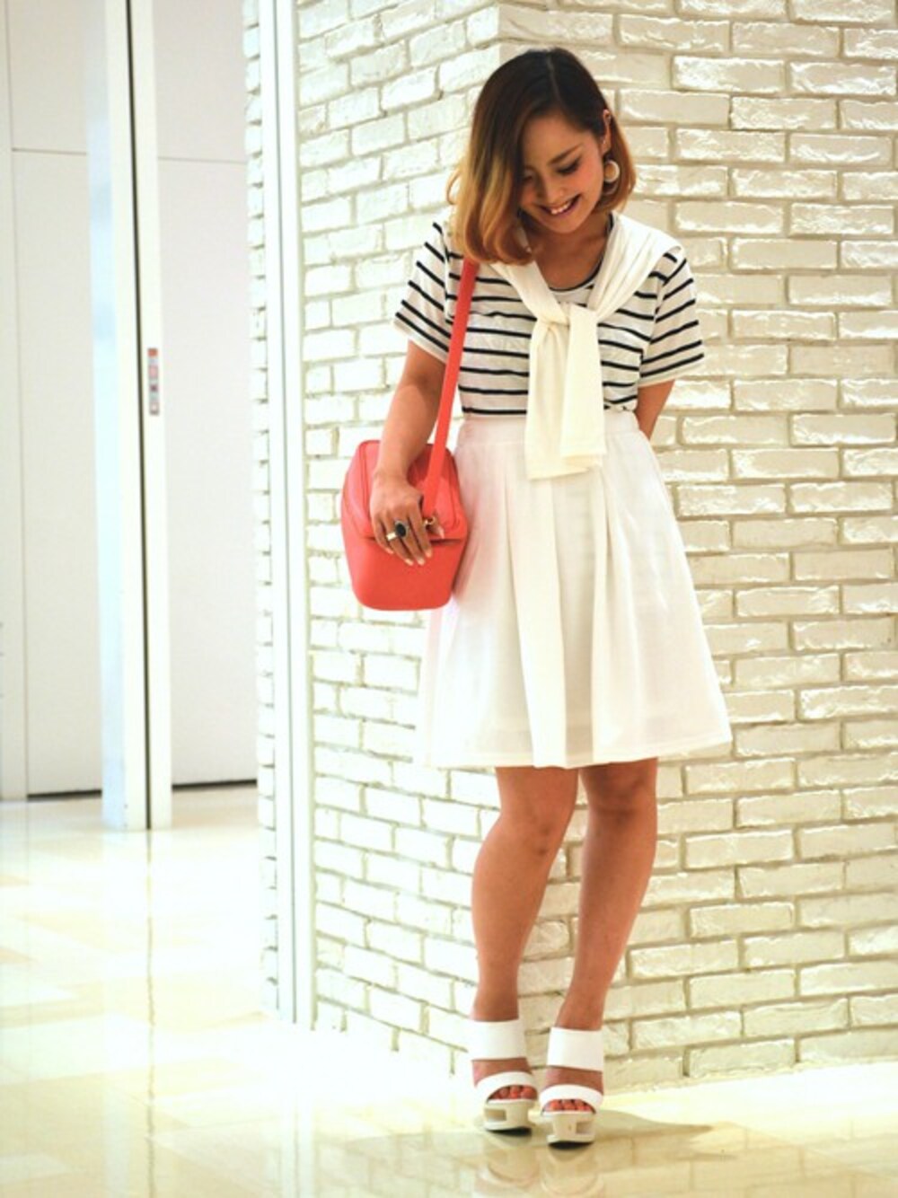 ひざ丈フレアスカートは、とってもガーリーなアイテム。カラーがピリッとアクセントになって、甘くなりすぎず、カジュアルなものからキレイめまで相性◎ぜひチェックしてみてくださいね!