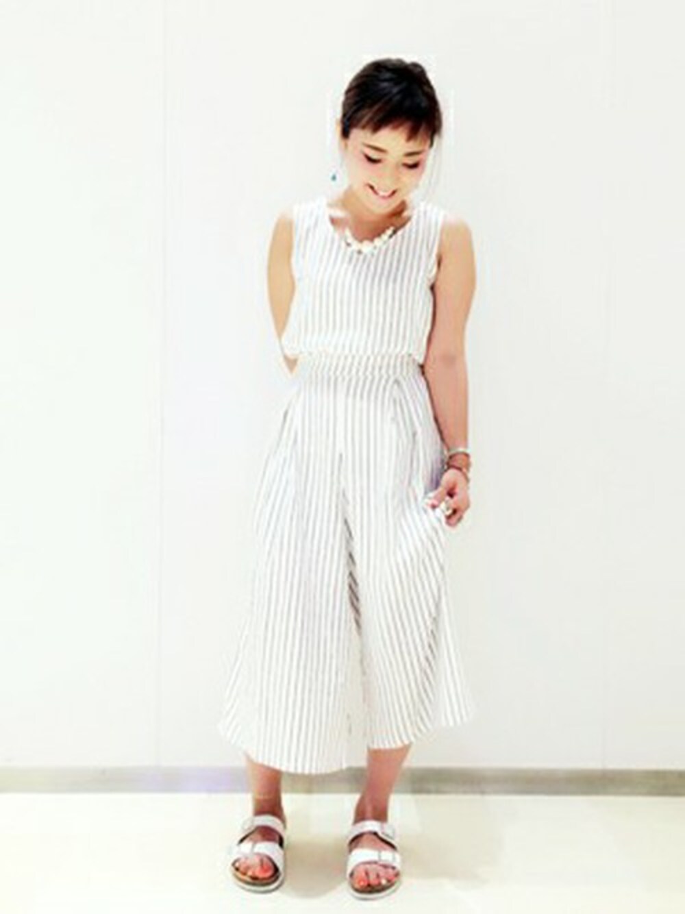 1枚でオシャレに着こなせるオールインワン♡ しかも!今年のトレンドで人気のガウチョタイプなんです(୨୧ ❛ᴗ❛)✧ 白にストライプでこれ1枚で一気に夏のコーディネートに(^-^)/ 肌寒い日にはカーディガンの肩掛けやシャツを羽織っても◎!