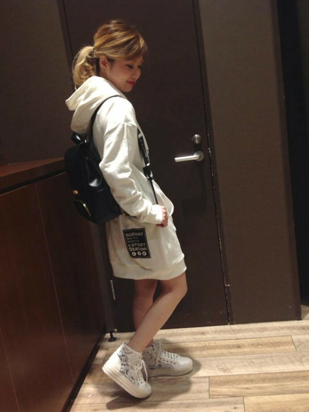 新作ワッペンパーカー あちこちに可愛いワッペンが貼りめぐらされたパーカー☆ よ〜く見るとワッペン一つ一つ凝っていて本当に可愛いんですよ 履いているスニーカーも春物新作 サイド部分がレースになっています^^