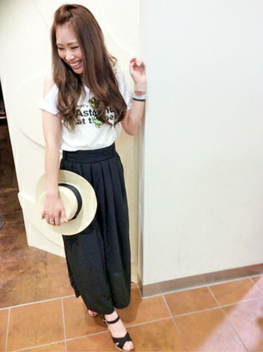 ガウチョパンツは、Tシャツで合わせてカジュアルに着こなしてみました\(^o^)/ 肩あきTシャツで、夏らしさをUP(*^_^*) 涼しげなコーディネートに♡