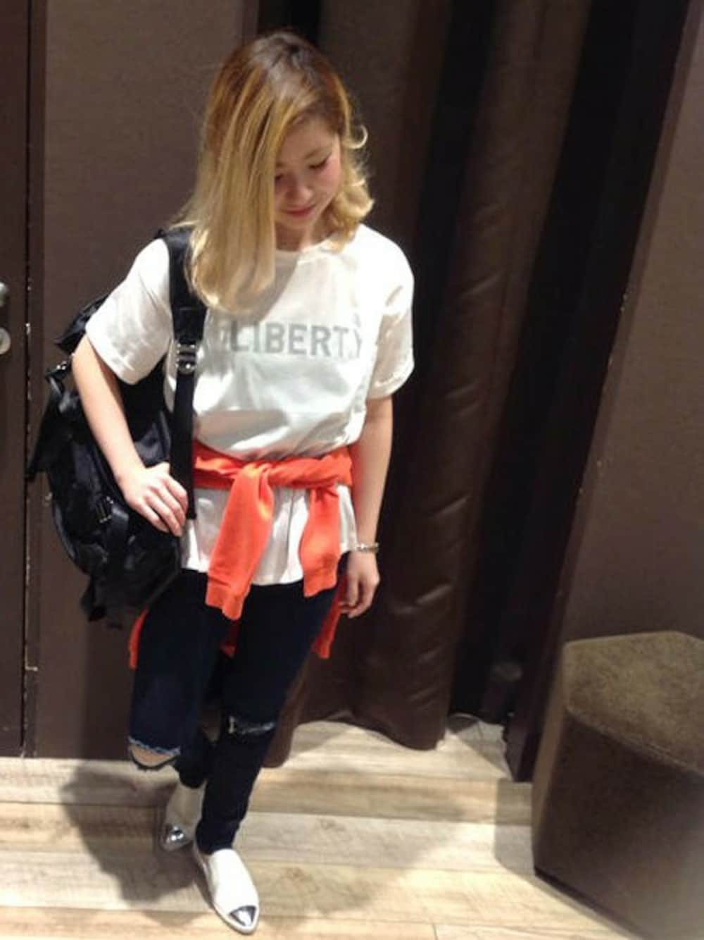 今季トレンドのスポーツMIXスタイリング♪ 腰に巻いたポイントカラーが一気にカジュアル感が演出できます!! ダメージのデニムでこなれ感を出しても◎