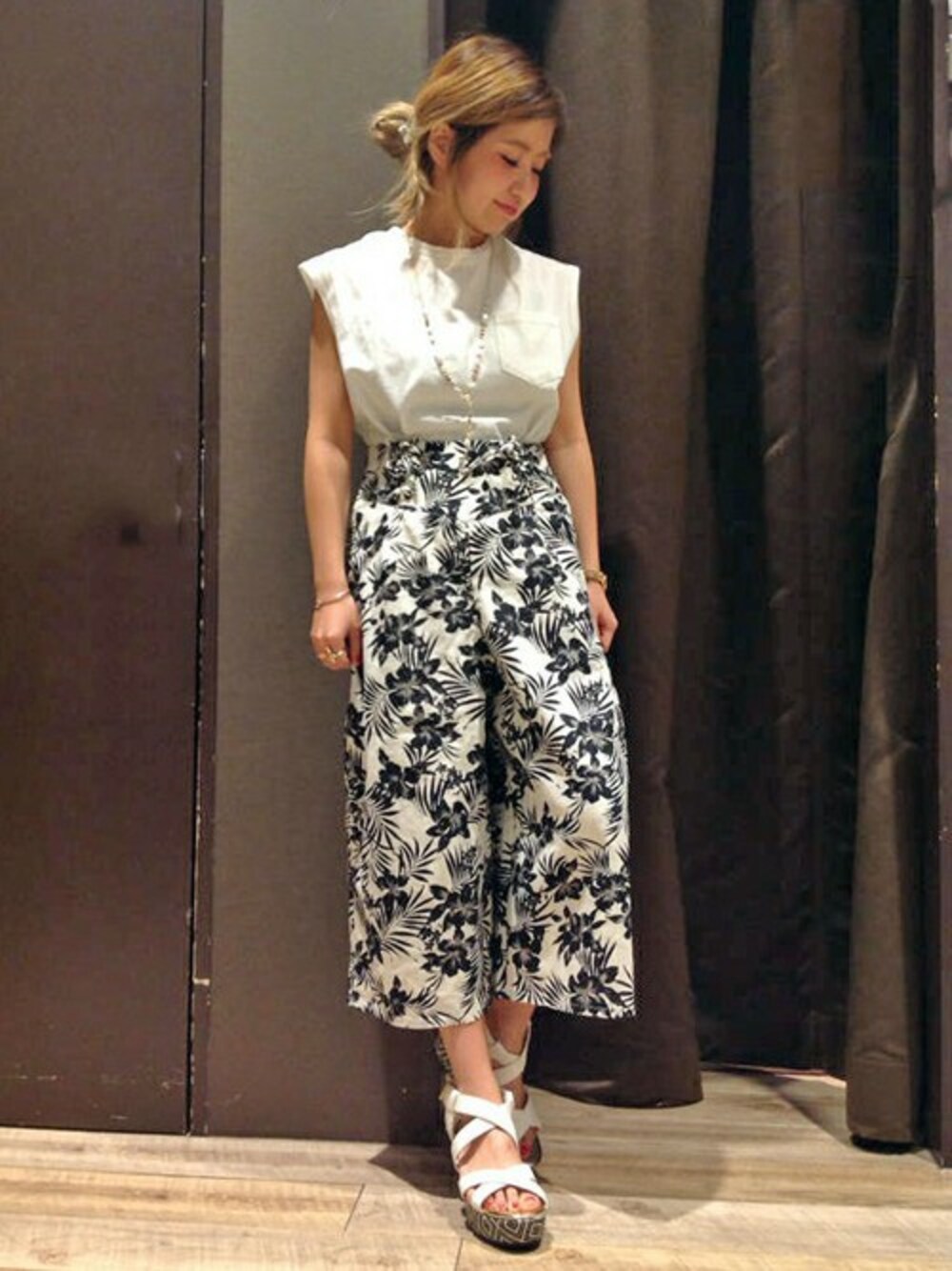 ガウチョは夏らしい花柄です(((o(*゚▽゚*)o))) かわいいですね〜♪♪ TOPSに無地のTシャツでシンプルに仕上げてみました୧꒰*´꒳`*꒱૭✧ ウエッジサンダルで足長効果も抜群♡
