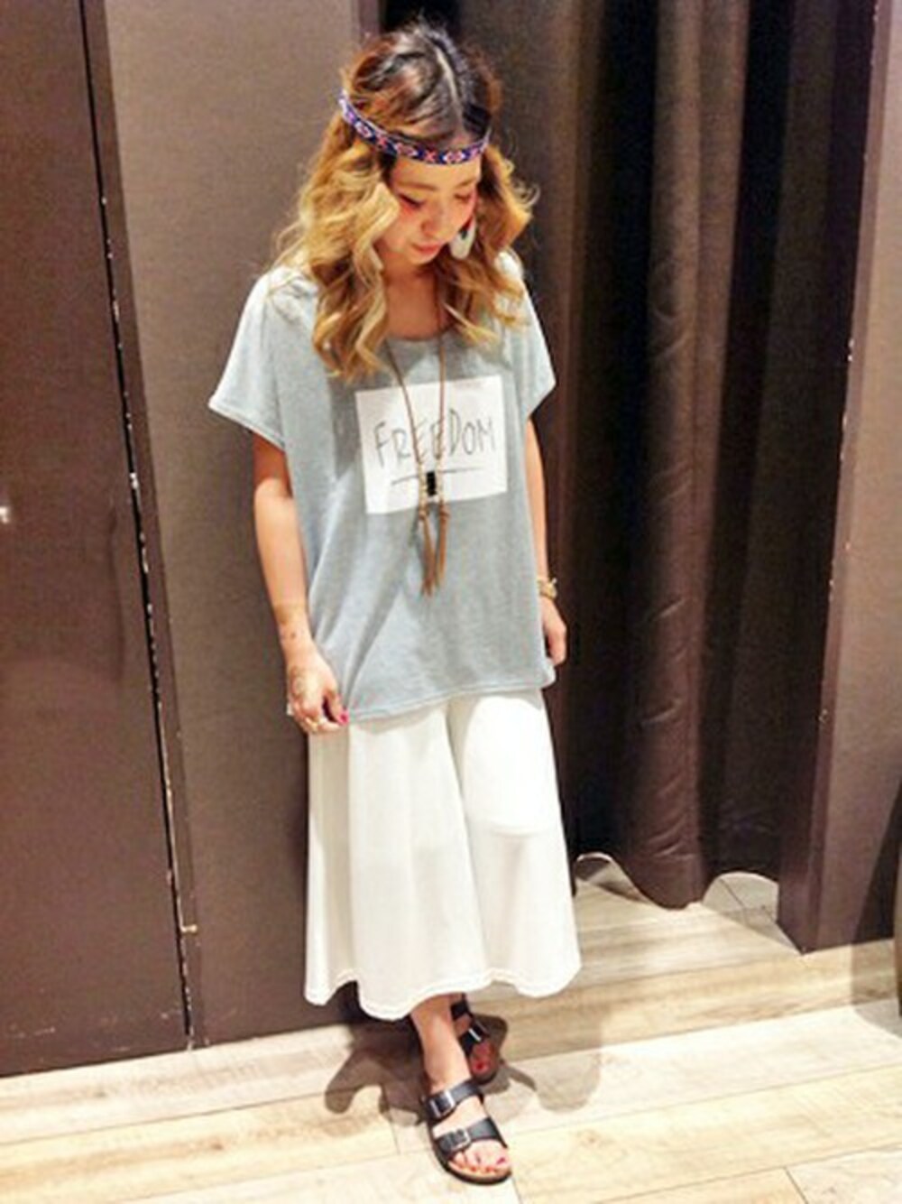 Tシャツ+ガウチョのシンプルコーデも小物づかいでフォークロアに♪ ガウチョは今年大人気で、合わせるTOPS・小物次第で大人っぽくにもカジュアルにもどちらにでも使えますよ♪