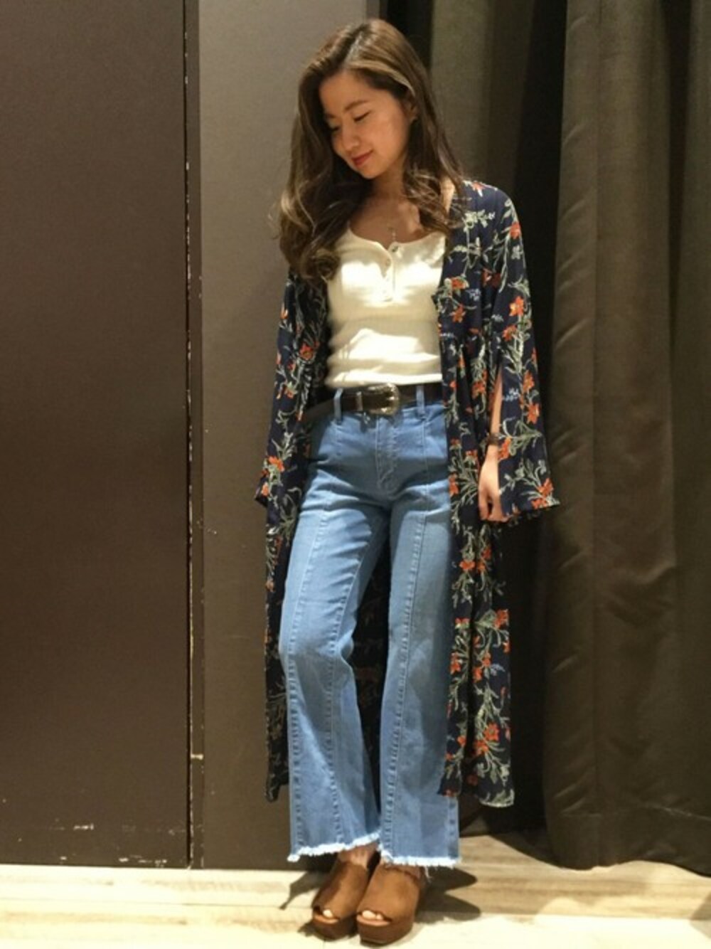 リバイバル70'sスタイル ♡ & ✌ 花柄ガウン、 フレアデニム、、 ブラウンのサボ、、、 まさに1970ヒッピースタイル☺♡ 花柄もデニムもサボも トレンドを意識したデザインになっています! なので古臭い印象になりません! 今季はどのお店も 柄物アイテムが増えて、 見るだけで楽しいですね♡♡