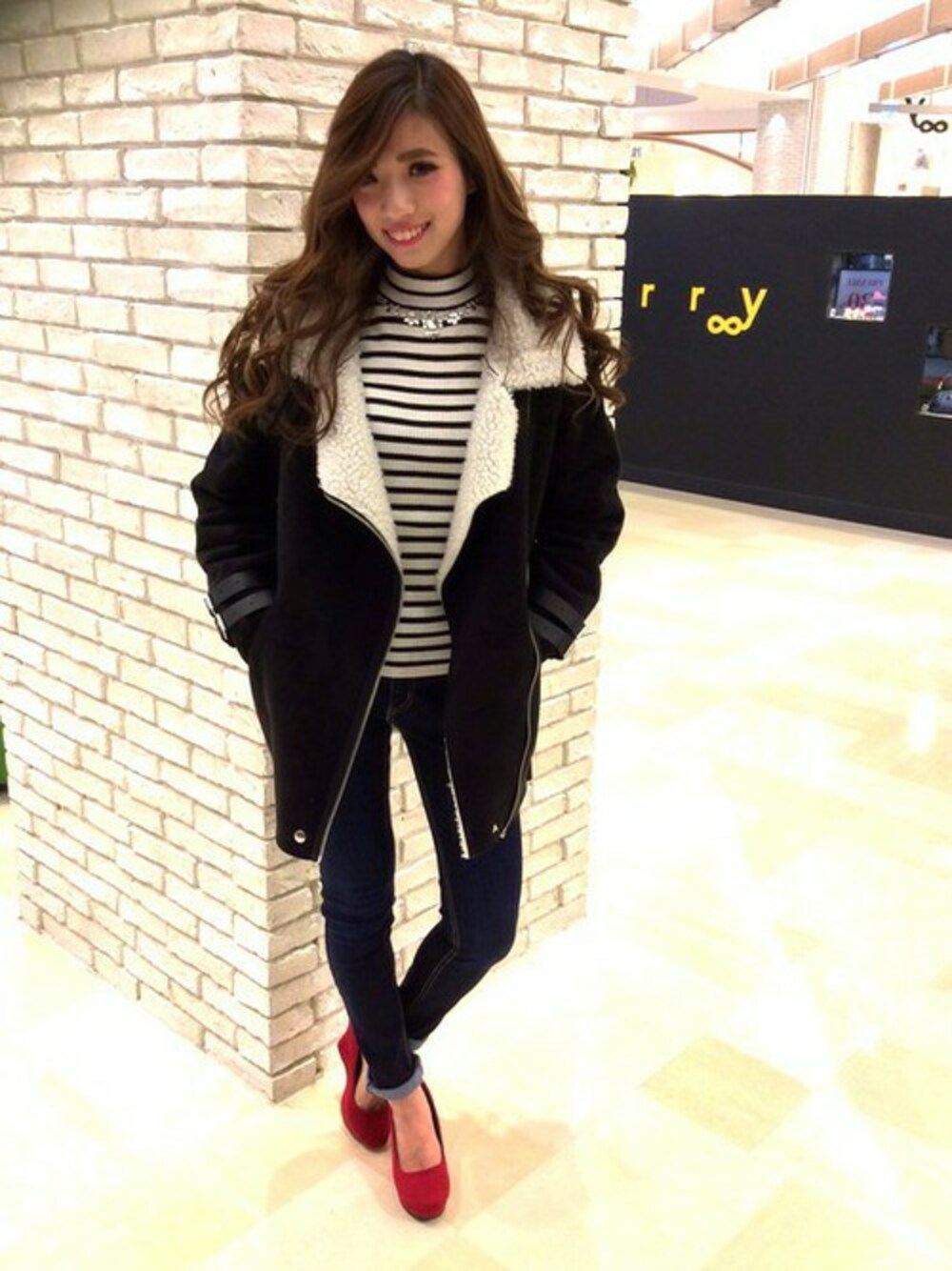 裏地のボアがボリュームたっぷりのフェイクムートンジャケットです。 寒い日には上までジップを上げてベルトをすれば風よけになって、さらにおしゃれです! サラッと羽織るだけでもカッコよく決まります! 一着持ってると着回し幅が広がりますよ♪